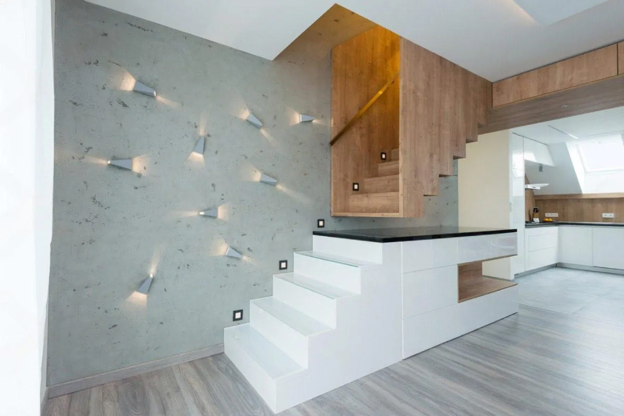 Прямая лестница, окружённая стенами: Такая лестница для узких проходов или коридоров — незаменимое решение. Лестница плотно интегрируется в архитектуру дома, а ощущение монолитности конструкции добавляет надежности и сдержанной эстетики.